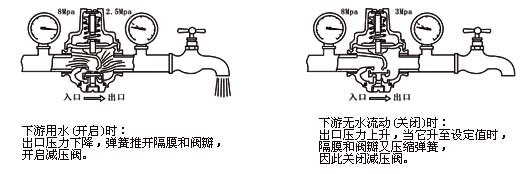 出口壓力作用在隔膜底面和閥瓣底面,當它超過彈簧設定值時,壓縮彈簧,使閥瓣關閉。只要下 游無水流動,出口壓力將基本保持在設定值(其變化量僅為入口壓力變化良的8%);當下游用水時,出口壓力下降,彈簧推開隔膜,打開減壓閥。水流連續(xù)流通一陣后,減壓閥的開啟產生自阻尼效應,使啟閉動作趨于平穩(wěn)。